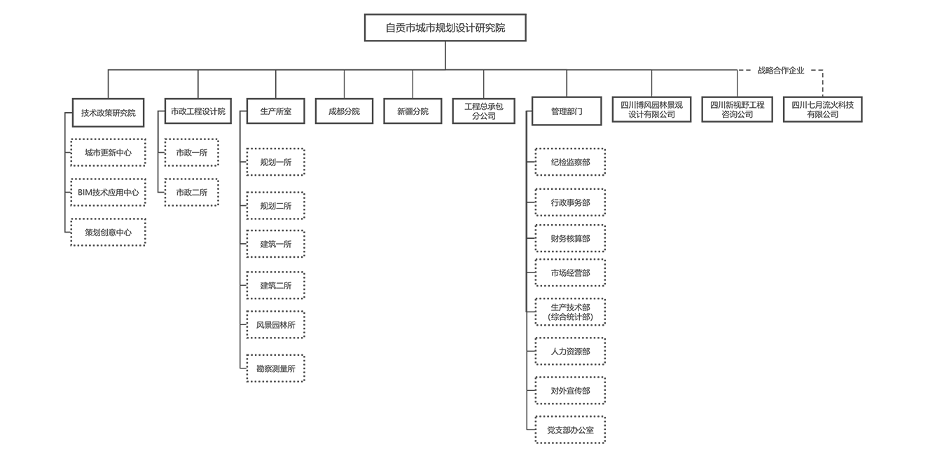 下属有2院(技术政策研究院)、8所、8部(办)、1个分公司(工程总承包分公司),3个分支机构(成都分院、宜宾分院和新疆分院),2个全资子公司四川新视野工程咨询有限公司、四川博风园林景观设计有限公司,以及战略合作企业四川七月流火科技有限公司。