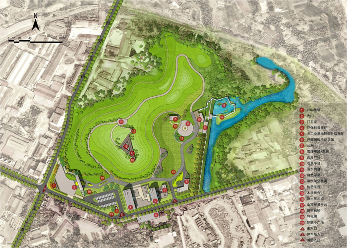 项目设计结合环境整治、环保科普两方面着手,并着重研究封场工程之上乔木种植、植物品种特性选择、排水等一系列封场风控工程专项设计。打造出老建筑改造、生态净化湿地、大地艺术山体3大景观体系。