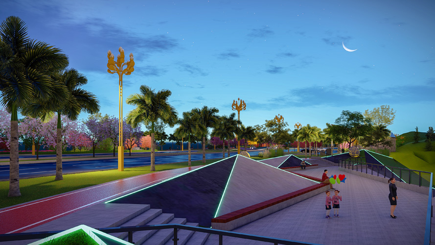 恐龙大道位于自贡市大安区东北部新城内,连接成自泸高速路出口,未来将是自贡市通向成都方向最便捷的公路交通通道,是自贡市北面的重要对外窗口。向南承接的是被誉为自贡未来之城的东部新城和东北部新城,是未来新区城市形象的重要门户。本次设计道路全长3.4公里,为两板三带式,道路红线控制宽度90m,形成25m+16m+8m+16m+25m路幅格局,设计时速为60-80km/h,绿化总面积约36公顷,其中中央绿化带1.3公顷,两侧及环岛33.7公顷。