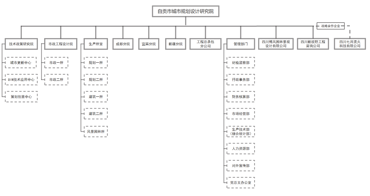 下属有2院(技术政策研究院)、8所、8部(办)、1个分公司(工程总承包分公司),3个分支机构(成都分院、宜宾分院和新疆分院),2个全资子公司四川新视野工程咨询有限公司、四川博风园林景观设计有限公司,以及战略合作企业四川七月流火科技有限公司。